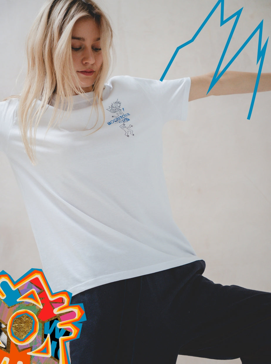 A young woman in the white Motion T-Shirt by Boomtown Fair Shop and dark pants poses with arms outstretched. Blue and red graphic doodles in the background add a playful, artistic flair with a hint of minimalist design.