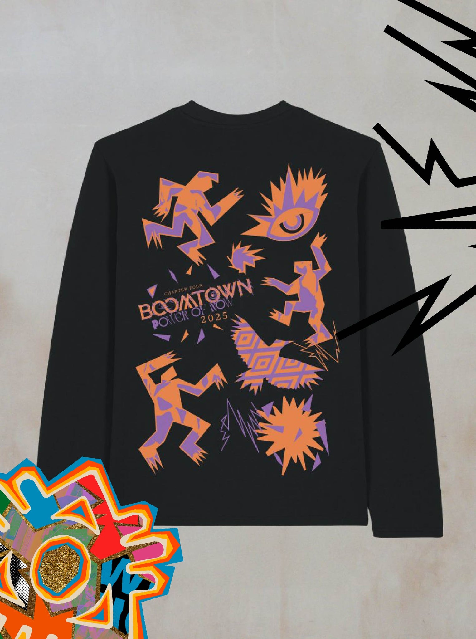 The Power of Now Icon Graphic Long Sleeve T-Shirt from Boomtown Fair Shop features bold orange and purple abstract figures, an eye, jagged shapes, and Power of Now 0.025 at the center—perfect for festival season.